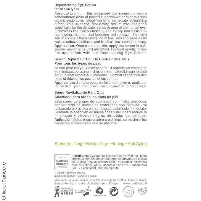- π± MONEY BACK GUARANTEE: We know you will be impressed with our replenishing eye serum and high-quality customer service so we offer a 30-day refund policy from date of purchase; please contact us if you have any concerns so we can rectify the situation quickly; BUY WITH CONFIDENCE GRATIAE ORGANIC REPLENISHING EYE SERUM, with retinol & vitamin E.