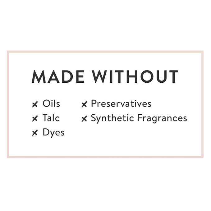 - Made without: oils, talc, preservatives, fragrances or dyes
