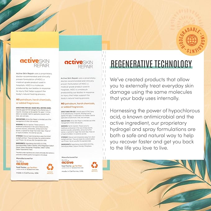 - FIRST AID HYPOCHLORUS SPRAY AND GEL: The technology used in Active Skin Repair is the same safe and gentle molecule used in hospitals & households worldwide; Hypochlorus Acid cleanse wounds to help skin recover faster