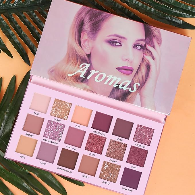- ► Nude aromas eyeshadow palette consists of 18 high pigmented shades and raging from ultra matte to dazzling shimmer-drenched hues. Explosion of high-pigmented pink coppers,and neutrals in matte, metallic, shimmer glittery textures. All shades are easy-to-blend, easy-to-build and long-lasting.This pallet has everything you need to transfer to your eyelid and perfect for every skin tone.