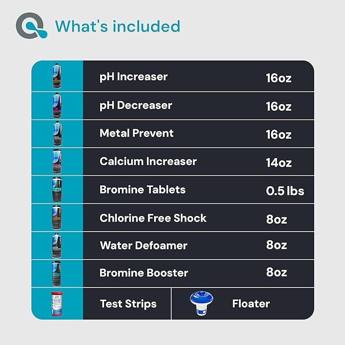 - COMPLETE SPA STARTER KIT: The Aquadoc hot tub starter chemicals kit comes with everything you need to keep your spa pristine. The hot tub kit includes Bromine Tablets, Bromine Booster, Calcium Increaser, Ph Increaser, Ph Decreaser, Chlorine-Free Shock, Defoamer, Metal Prevent, Floater, and Test Strips.