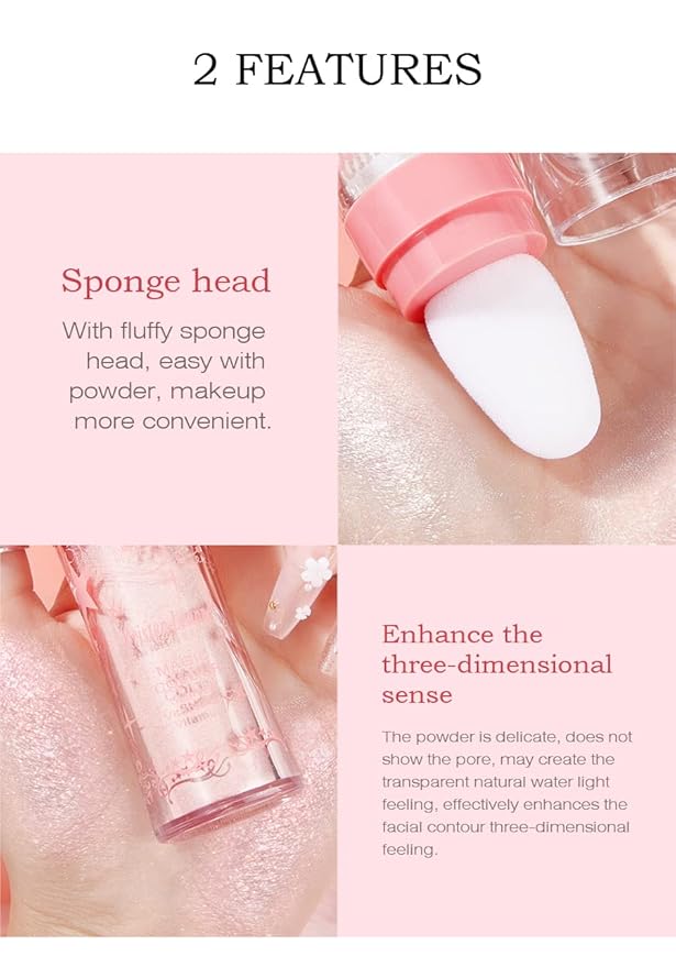 - 【Multi-use Shimmer Highlighter & Blush Powder】The shimmer highlighter powder is not just a highlighter, but a blush too. It can be used not only on the face but also on the clavicle, eye, body, lip, and hair, use it anywhere you want to apply, the highlighter to make the skin shimmer and sparkle, with light-diffusing pigments and instant sponge head design to enhance and perfect skin. Natural 3D brightening and beautifying powder blush high-gloss powder, suitable for all skin tones.
