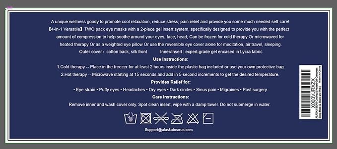 - Cool sensation, Versatile design -- Two pack eye masks with a 2-piece gel insert system, can be frozen for cold therapy Or microwaved for warm therapy Or as a weighted pillow Or use the reversible eye cover alone for meditation, air travel, sleeping
