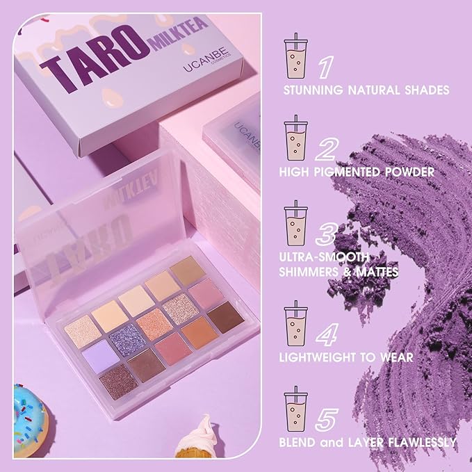 - ❤. This eye palette is inspired by taro milk tea, mixture of 15 stunning warm and cool toned shades that velvety & go on smoothly texture with matte shimmery finishes to create next level looks to unleash your artistry. Each high pigmented, easy to blend, buildable, and long-lasting, created to suit every skin tone and eye color.