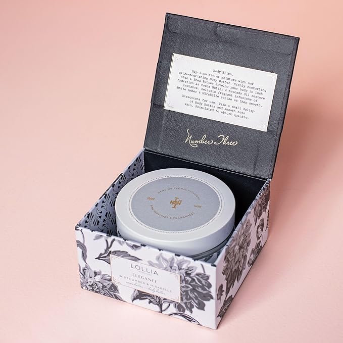 - TIMELESS BODY MOISTURIZER: Lollia Elegance Body Butter is ultra-nourishing and richly comforting. Delicate floral infusions of White Amber and Mirabelle leave the skin delightfully scented.