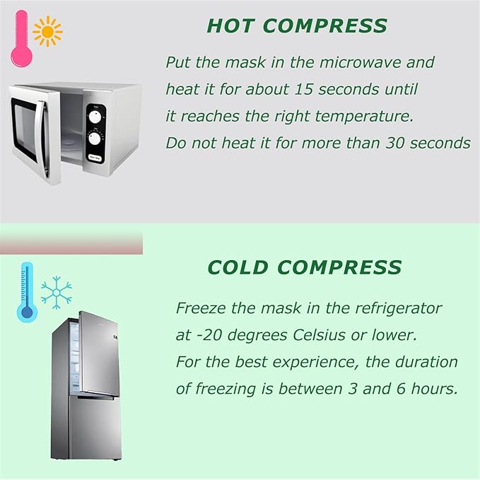 - How to Use Just chill in refrigerator 2 hours for cold therapy, After the mask has reached the desired temperature, simply apply to the face. (Do not put in the freezer for more than 2 hours, No time limit on the refrigerator). For hot use just place eye mask in microwave oven for 10 second.