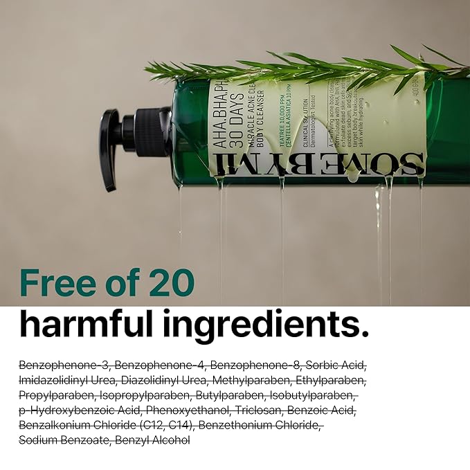- MIRACLE BODY CLEANSER : This body cleanser is specifically designed for Body Acne skin and contains AHA, BHA, and PHA, which help to remove dead skin cells, sebum, and skin waste. The product's micro-bubble technology is effective in cleansing pore waste, while natural cleansing surfactants are used to protect sensitive skin. Additionally, the product is free of 20 types of artificial ingredients and has been dermatologically tested for sensitive skin
