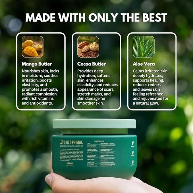 - DEEP MOISTURIZATION: Made with cocoa butter, mango butter, aloe & more - your skin will thank you for the hydrating and nourishing ingredients in our PRIMALS body lotion. Say goodbye to dry, ashy skin!