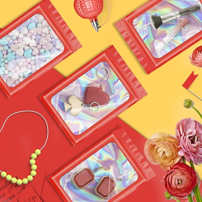 ANZNKU 100 Pcs Smell Proof Mylar Resealable Bags, Holographic Packaging Bags, Resealable Odor Foil Pouch Zip Bags with Clear Window for Food Storage and Lipgloss, Jewelry Lash (Red, 3.9 x 7.1 Inch)