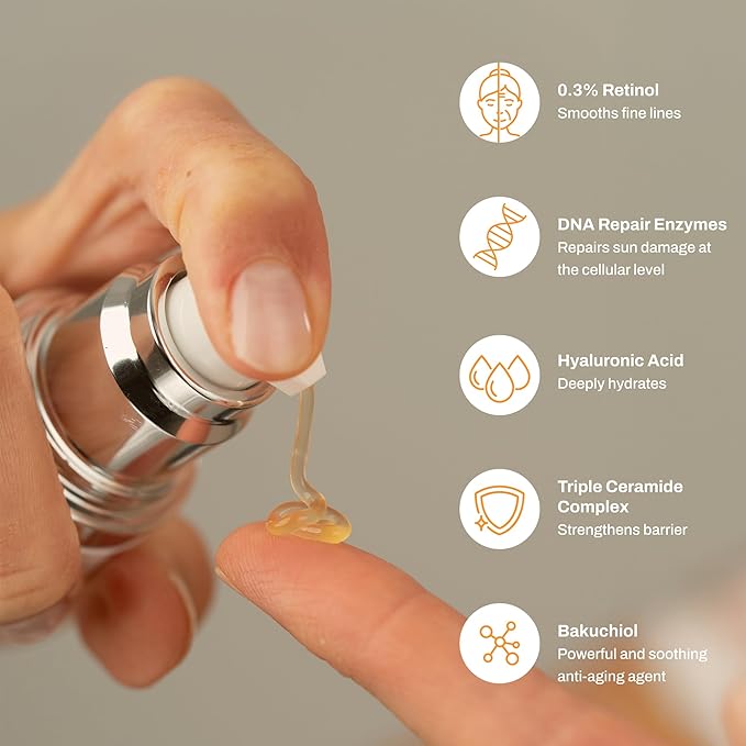 - GENTLE ANTI-AGING TREATMENT: Combines 0.3% retinol with plant-based bakuchiol to reduce signs of aging and improve skin tone without irritation or dryness.